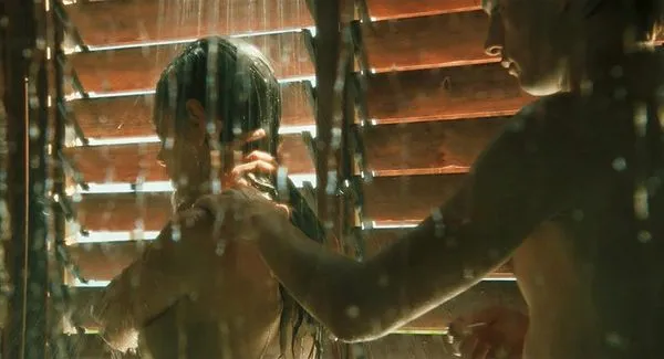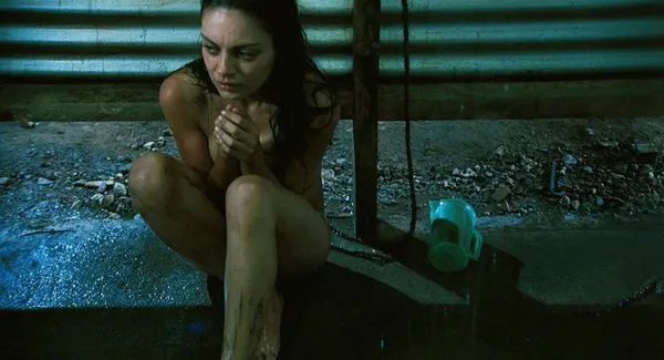 I den næste scene sidder Mila Kunis nøgen på en plet af beton uden for et udendørs brusebad. Hendes knæ trukket op mod brystet, så vi ser bare en smule spaltning kigge ud.